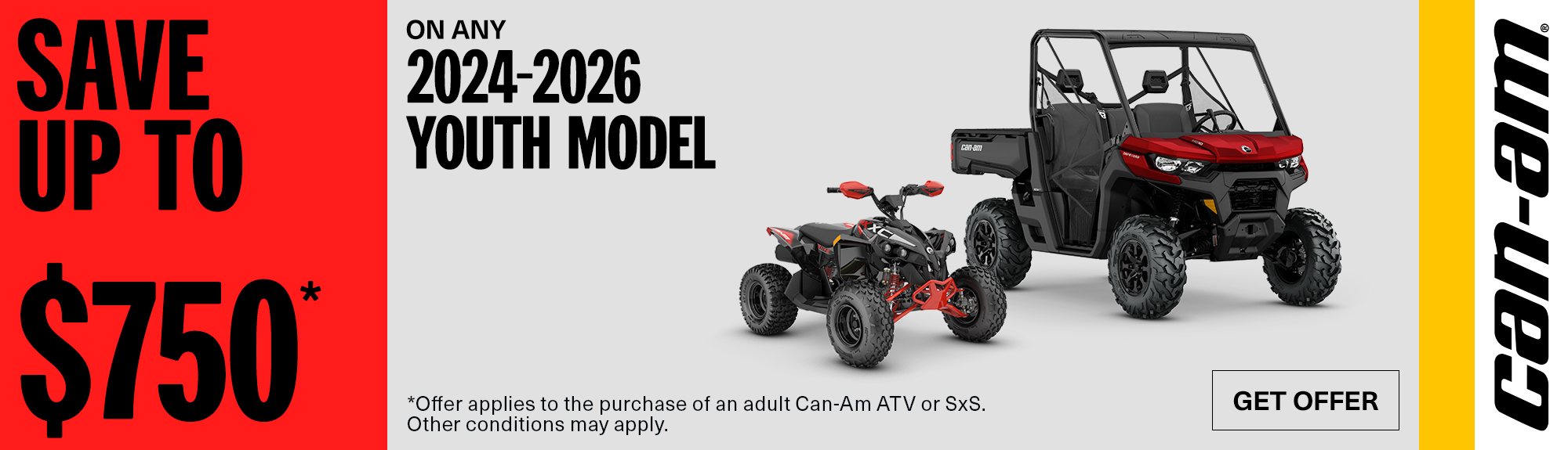 Offers valid in U.S.A. only from November 1, 2025 to March 31, 2026. The conditions may vary depending on your location and this offer is subject to termination or change at any time without notice. This offer is not refundable, exchangeable or transferable (including from one dealership to another), cannot be redeemed for cash, credit or other products of equivalent value and cannot be combined with any other offer or rebate. Null where prohibited by law. Until supplies last. Returns of any portion of the purchase will require equal forfeiture of offer or amount equal to the offer. Eligible models are new and unused 2024-2026 Can-Am ATV or Ski-Doo Youth models.