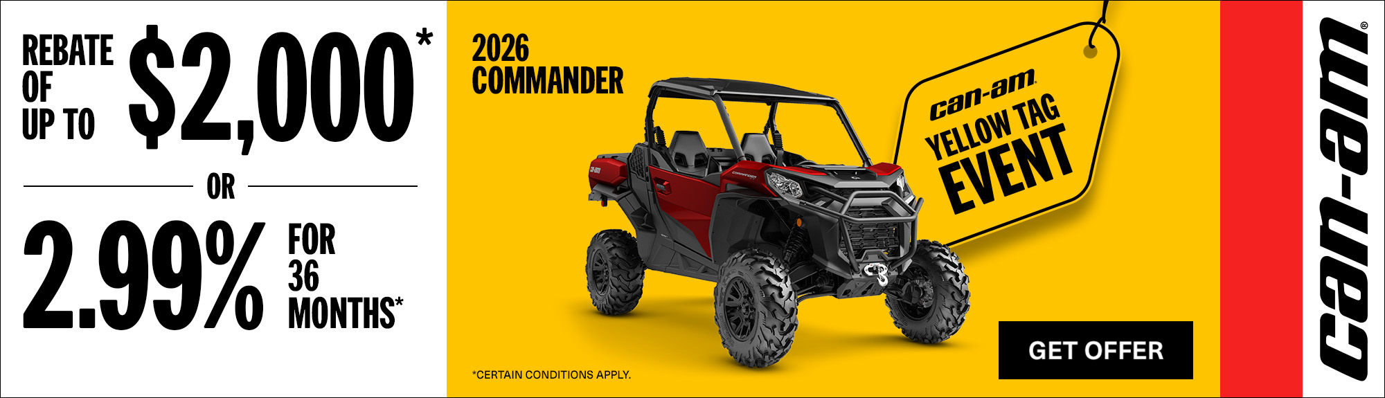 """©2026 Bombardier Recreational Products Inc. (BRP). All rights reserved. ®, ™ and the BRP logo are trademarks of BRP or its affiliates. In the U.S.A., products are distributed by BRP US Inc. Offers valid in U.S.A. only from March 1, 2026 to April 30, 2026. The conditions may vary depending on your location and this offer is subject to termination or change at any time without notice. This offer is not refundable, exchangeable or transferable (including from one dealership to another), cannot be redeemed for cash, credit or other products of equivalent value. Null where prohibited by law. Until supplies last. Until supplies last. Eligible units for the announced rebate are all new and unused select 2026 Commander 1000R and eligible units for the announced promotional financing are all new and unused 2026 Commander models. Other Can-Am off-road models may qualify for rebates or promotional financing, see local dealers for details.