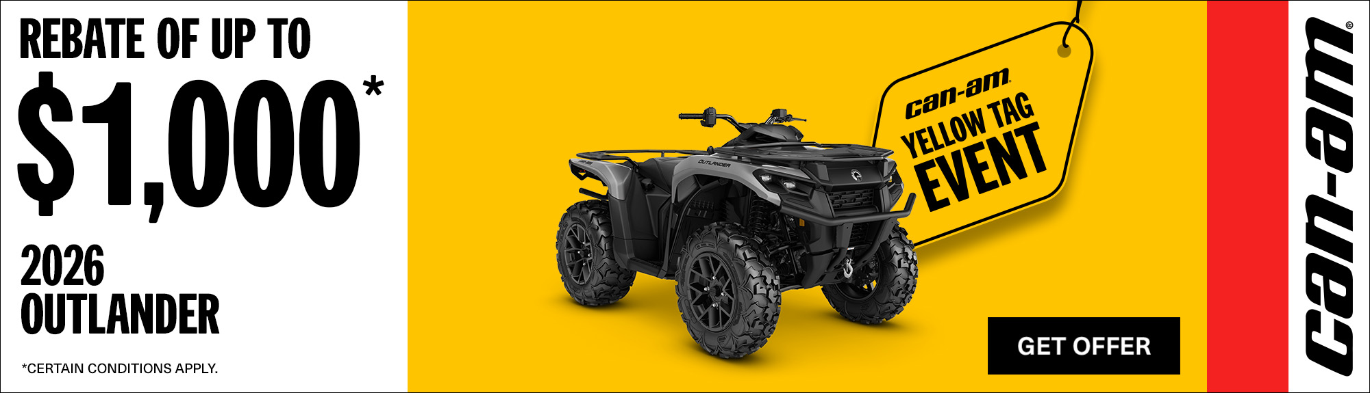 † Get a $500 rebate on eligible models: Consumers who purchase or purchased a new and unused 2024-2026 adult Can-Am ATV, Can-Am SSV, Lynx or Ski-Doo model (excl. NEOs) are eligible to an additional $500 rebate on any 2024-2026 eligible Youth model. Limit of one $500 rebate per transaction and per consumer. The purchase of the adult Can-Am ATV or Can-Am SSV vehicle must take place between July 1st, 2025 and March 31, 2026. The purchase of the adult Lynx or Ski-Doo vehicle must take place between April 1st, 2025 and March 31st, 2026.